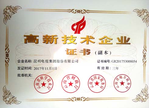 2017年12月,昆明電纜集團股份有限公司再次通過了高新技術企業的認定,被云南省科學技術廳、云南省財政廳、云南省國家稅務局、云南省地方稅務局認定為“高新技術企業”。[詳細]